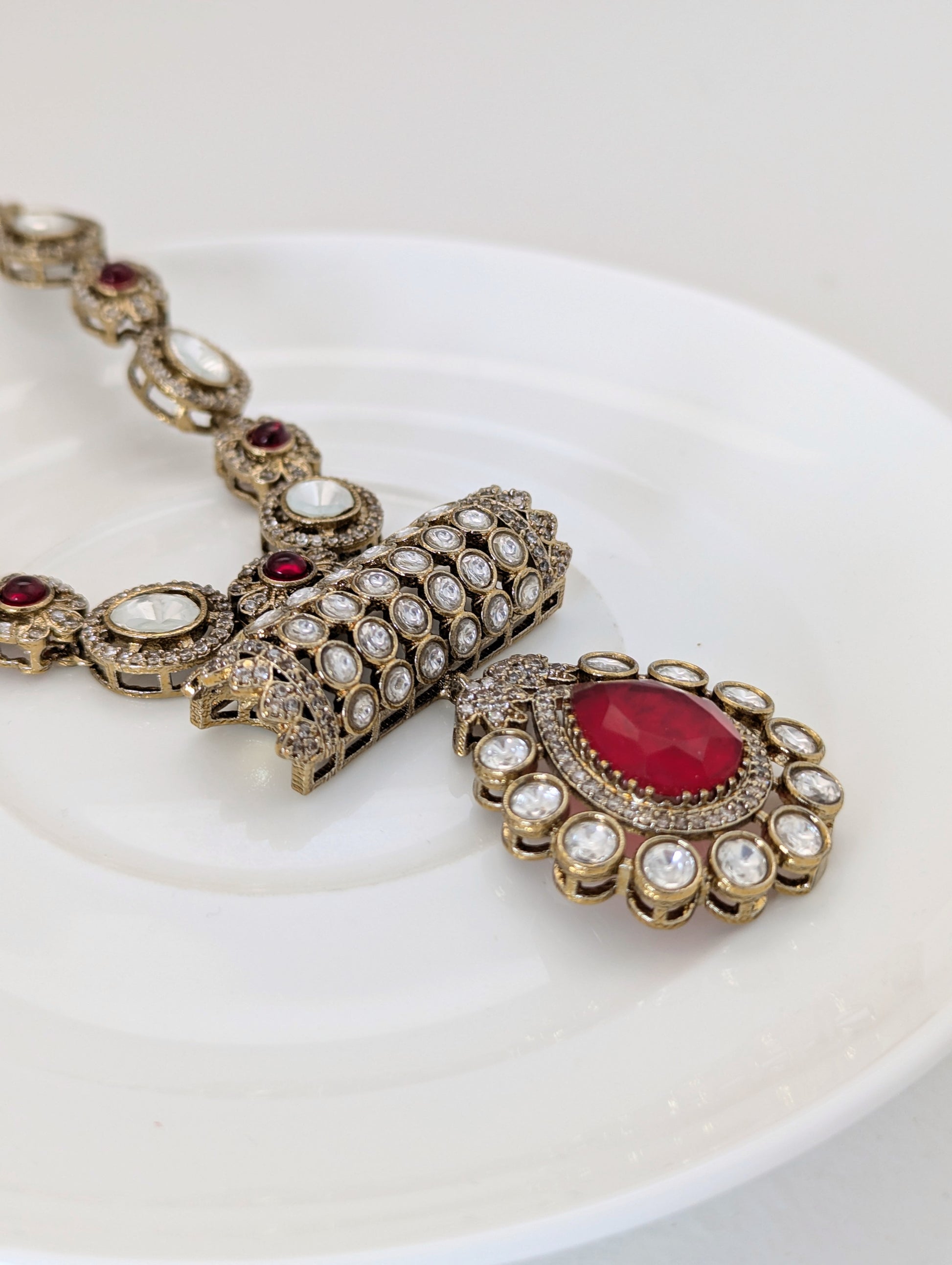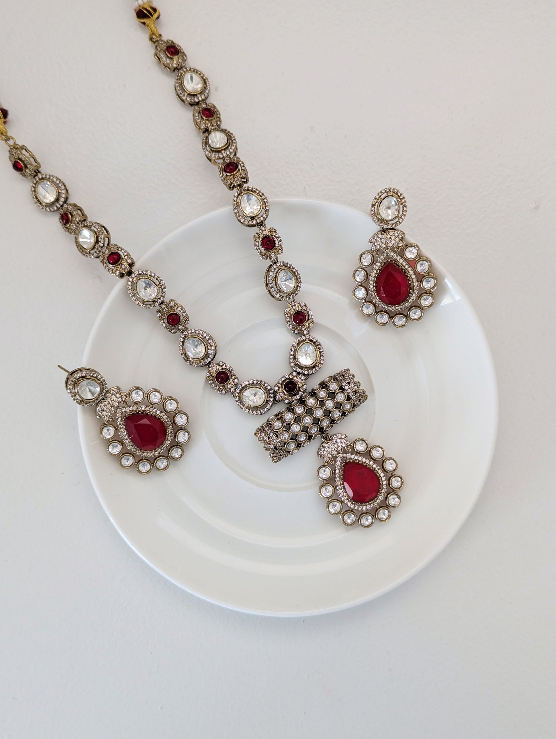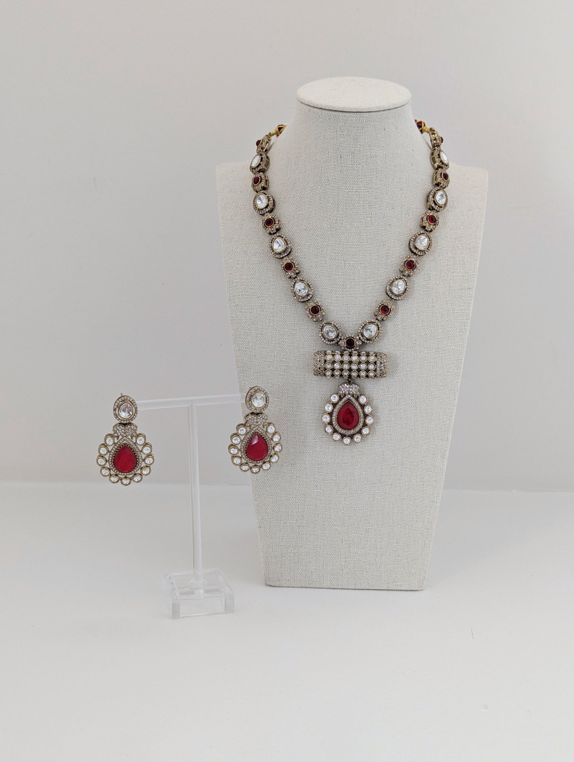 This elegant jewelry set features a regal necklace and matching earrings, adorned with brilliant white stones and deep red teardrop-shaped centerpieces. The necklace showcases alternating red and white gemstones framed in antique-finish gold, leading to a bold rectangular motif encrusted with white stones and a striking red pendant. The coordinating earrings mirror the pendant design, with intricate detailing and a radiant, vintage-inspired charm—perfect for special occasions or traditional attire.