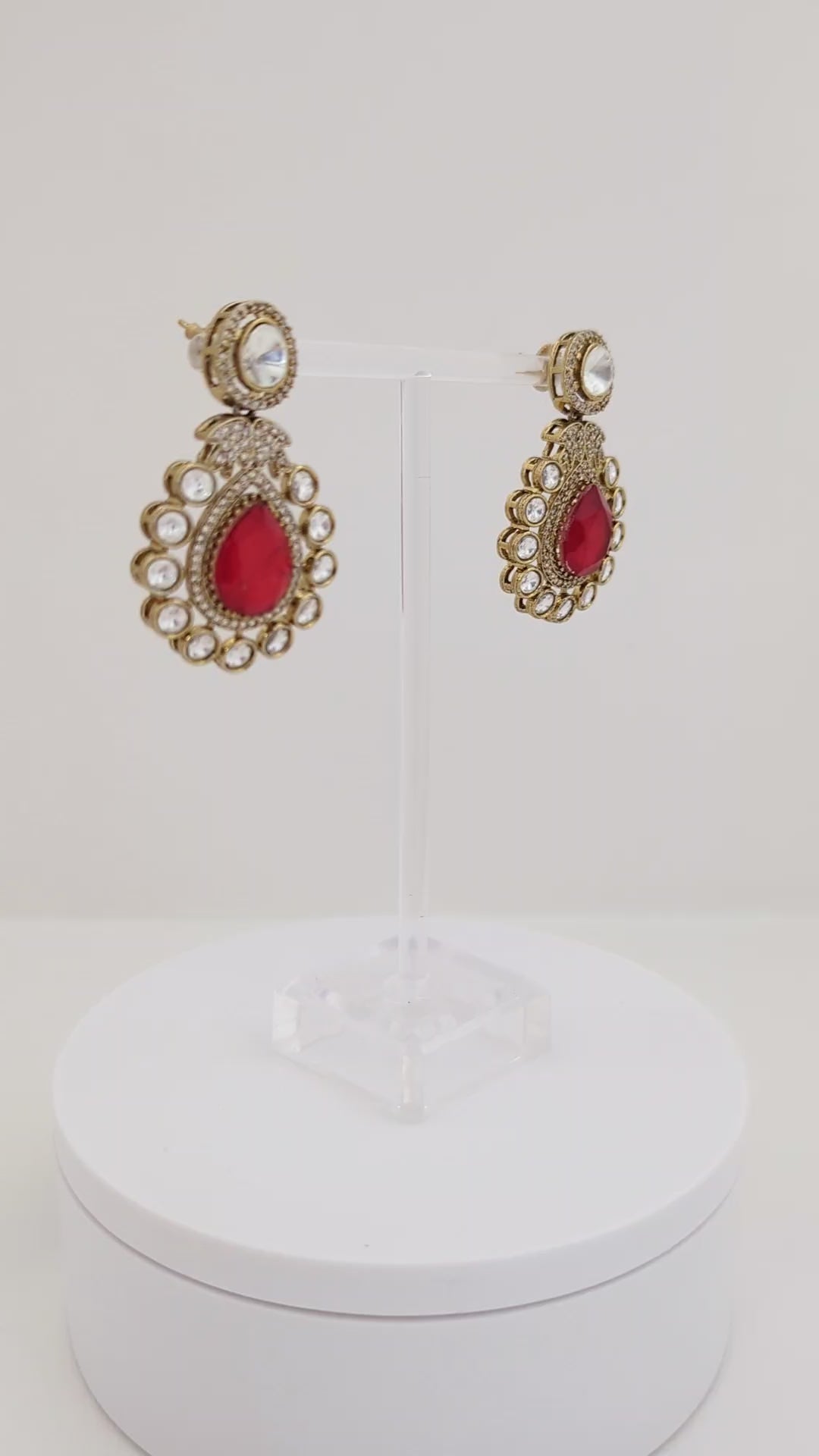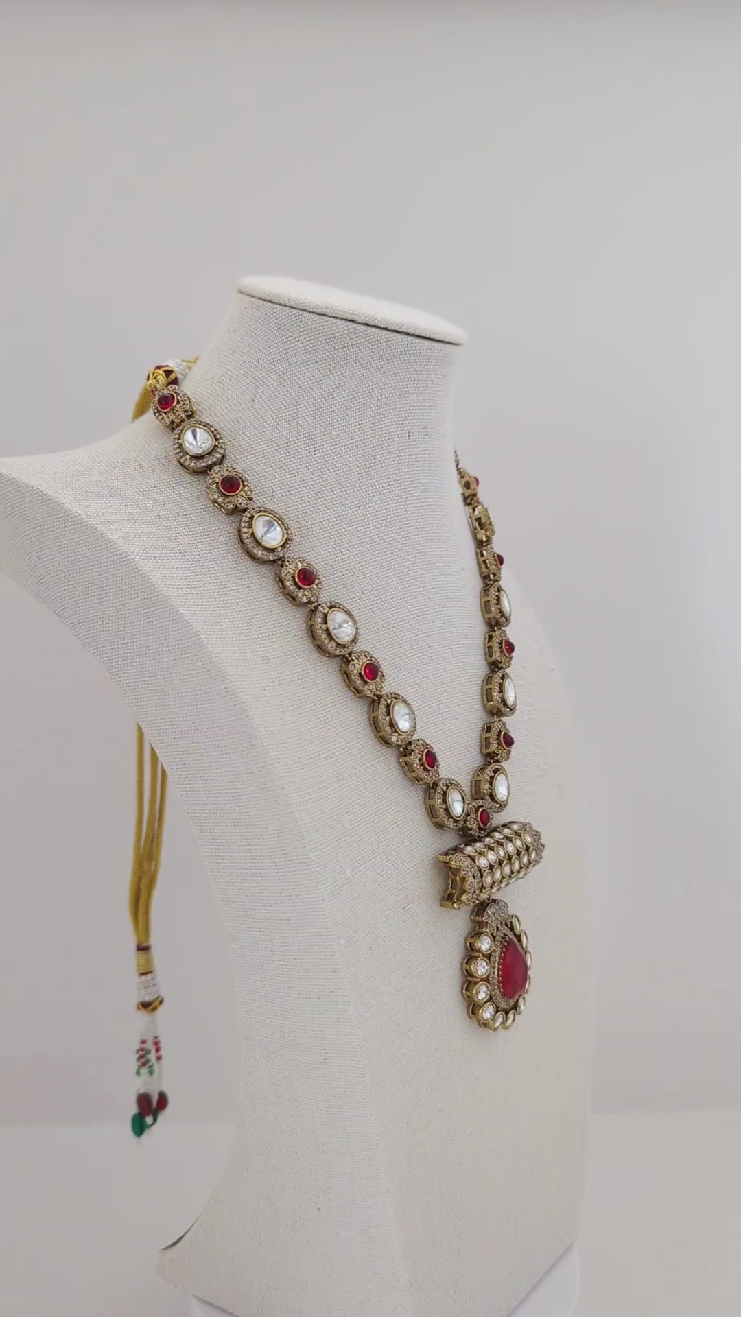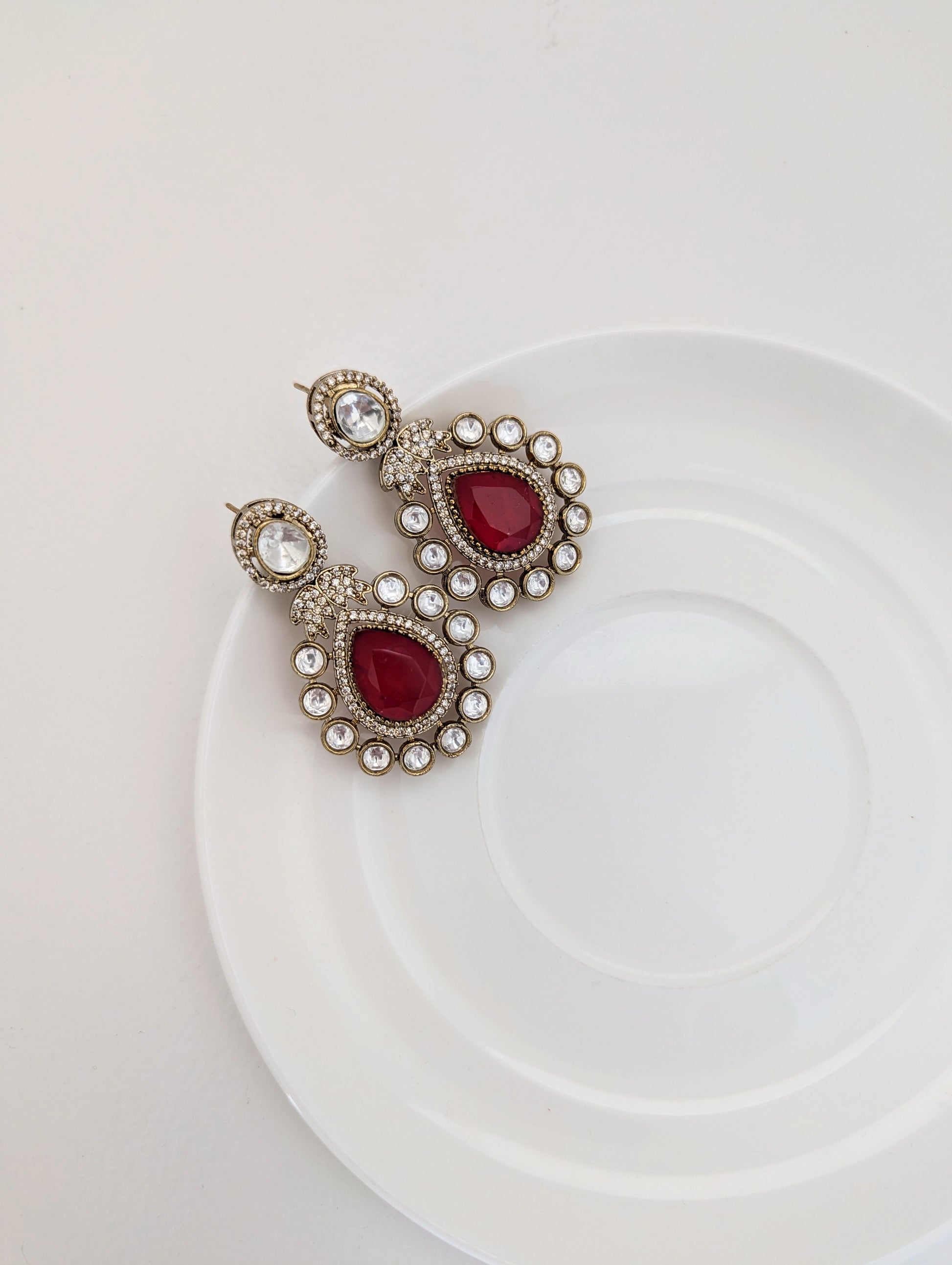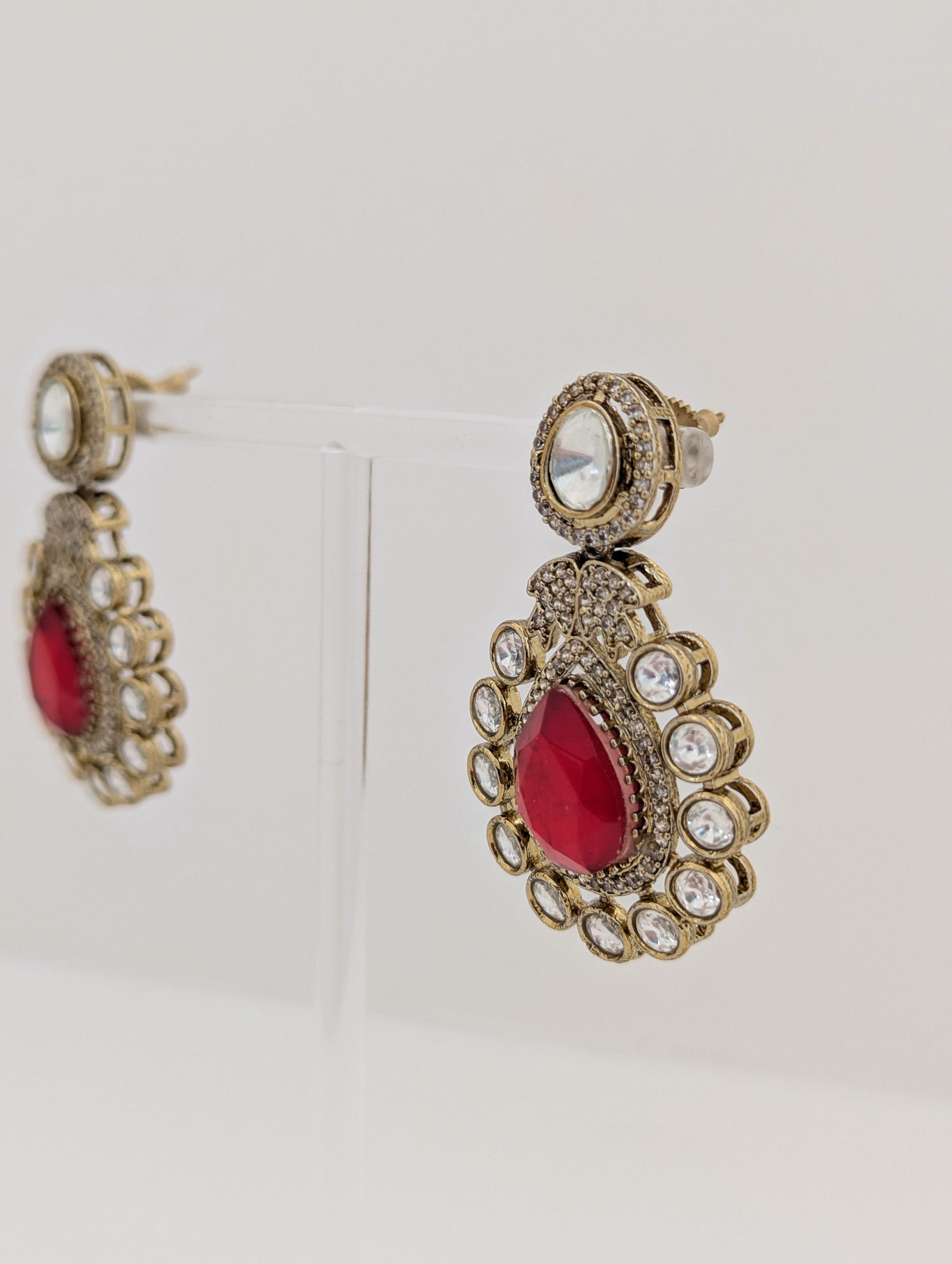 This elegant jewelry set features a regal necklace and matching earrings, adorned with brilliant white stones and deep red teardrop-shaped centerpieces. The necklace showcases alternating red and white gemstones framed in antique-finish gold, leading to a bold rectangular motif encrusted with white stones and a striking red pendant. The coordinating earrings mirror the pendant design, with intricate detailing and a radiant, vintage-inspired charm—perfect for special occasions or traditional attire.
