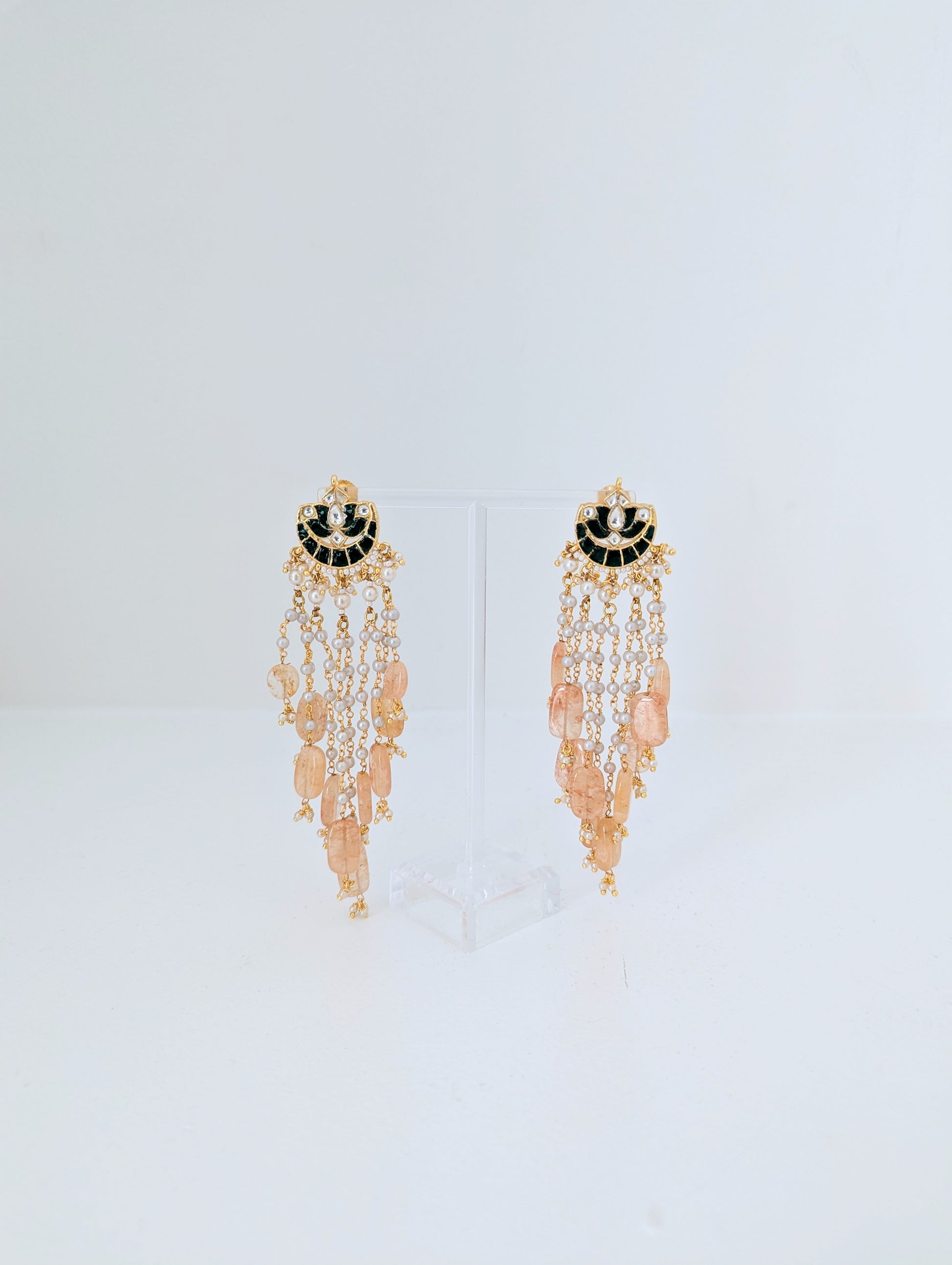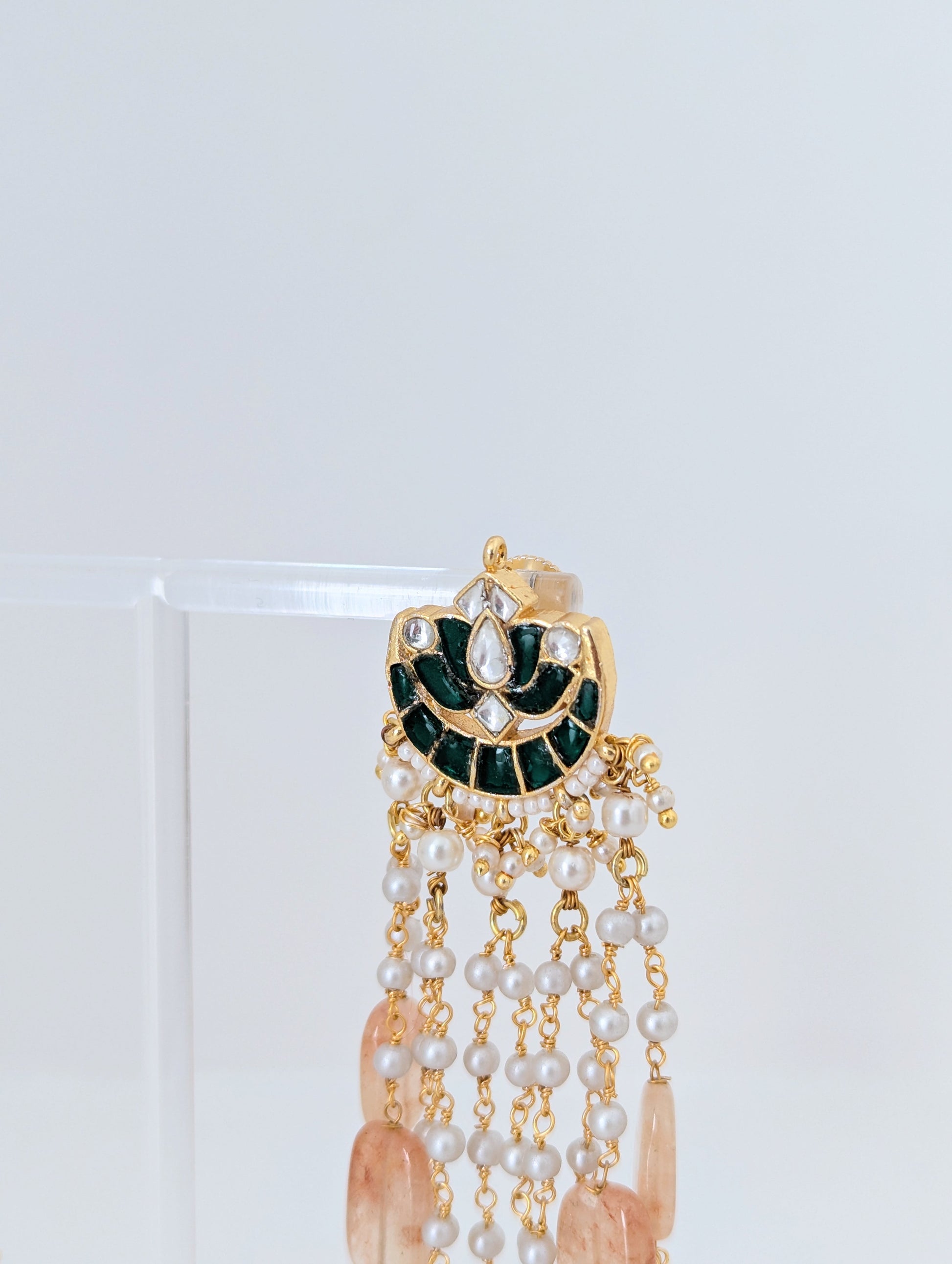 Each pair is handmade. Champagne Coloured beads with Dark Green Enamel.
