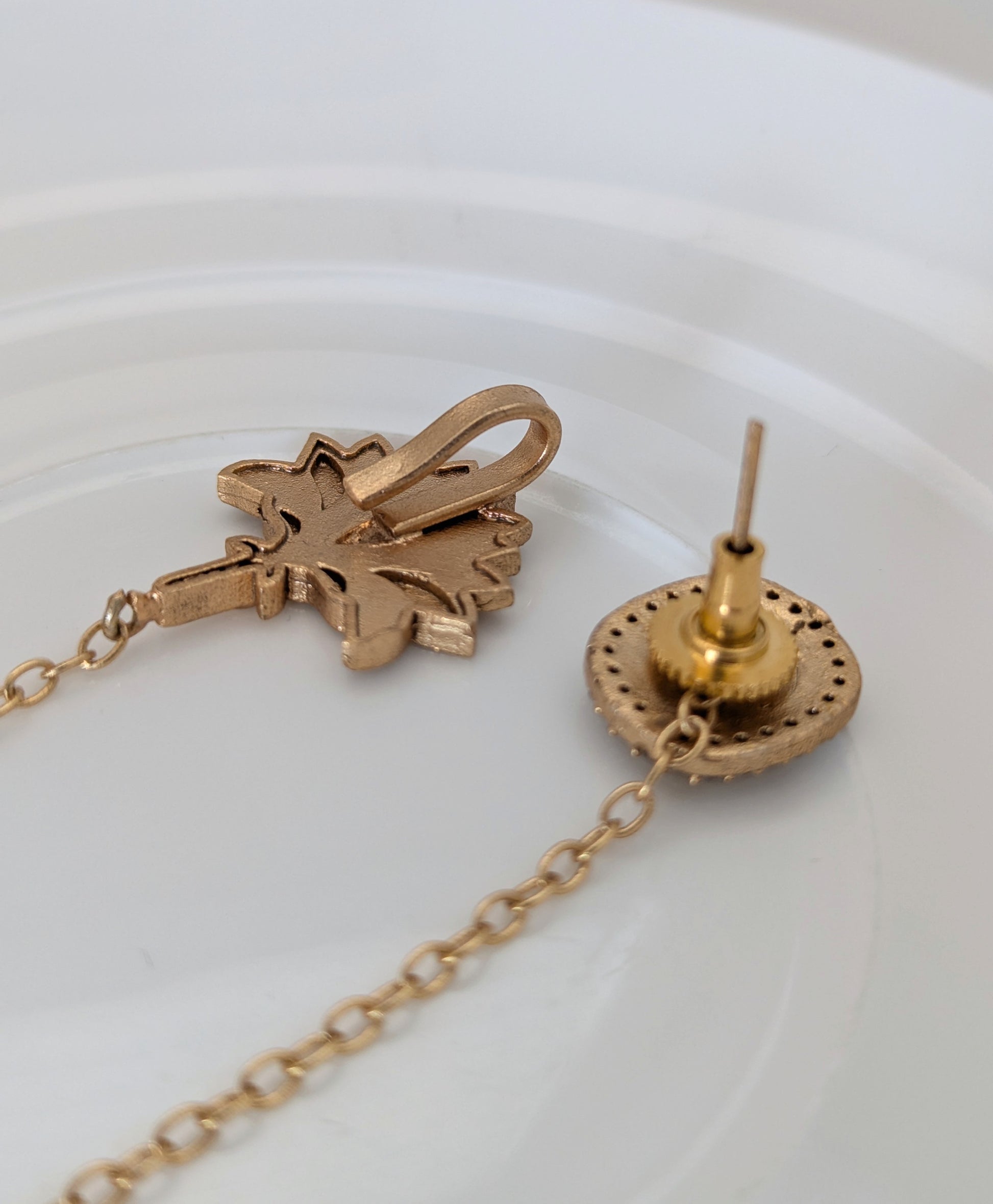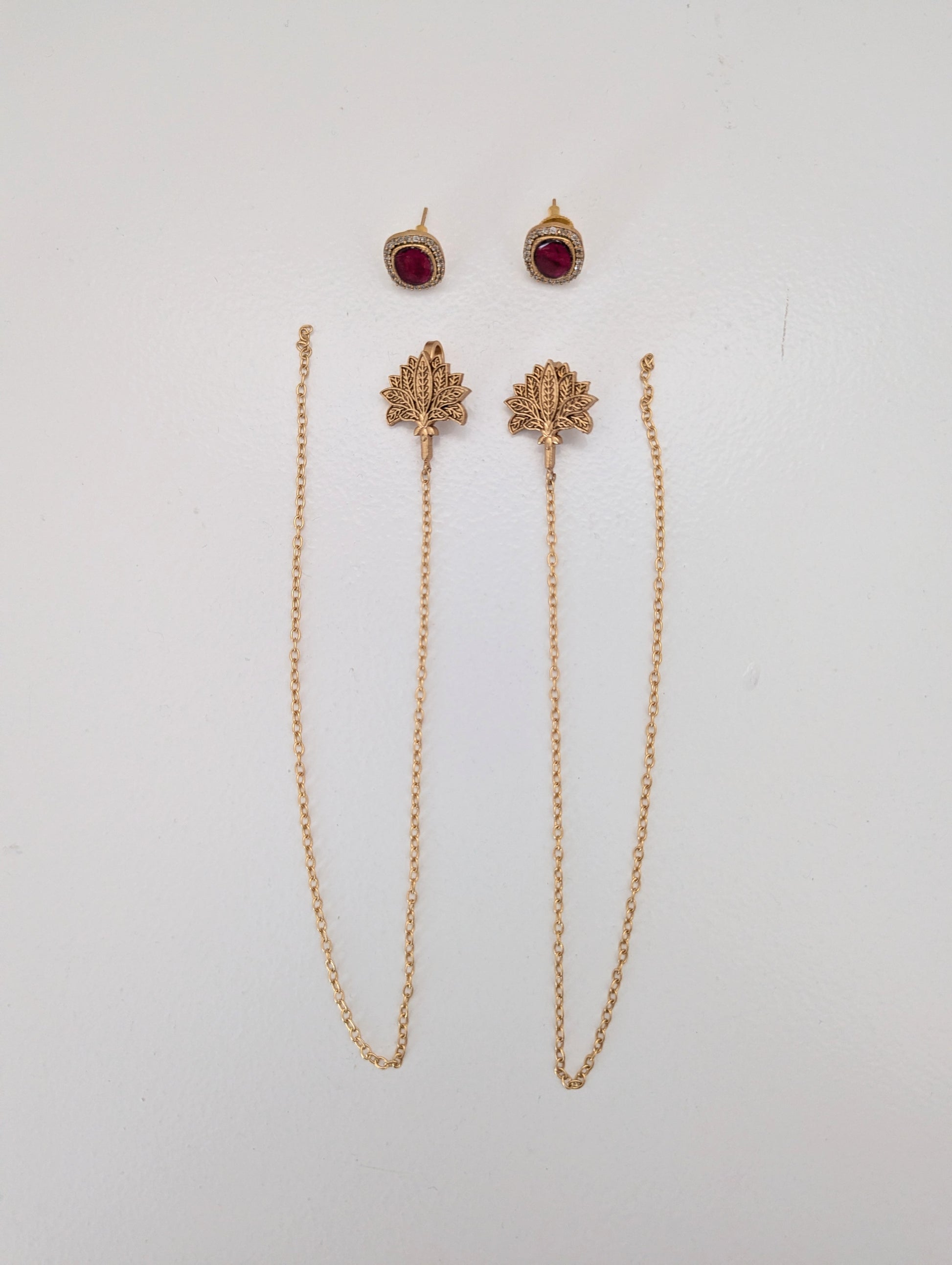 These elegant earrings feature ruby red stone studs bordered with delicate crystals, paired with intricately carved lotus-shaped clips connected by fine gold-toned chains. The lotus clips are designed to secure into the hair, adding a graceful, traditional touch. The stud and chain components are detachable, allowing versatile styling for different looks.